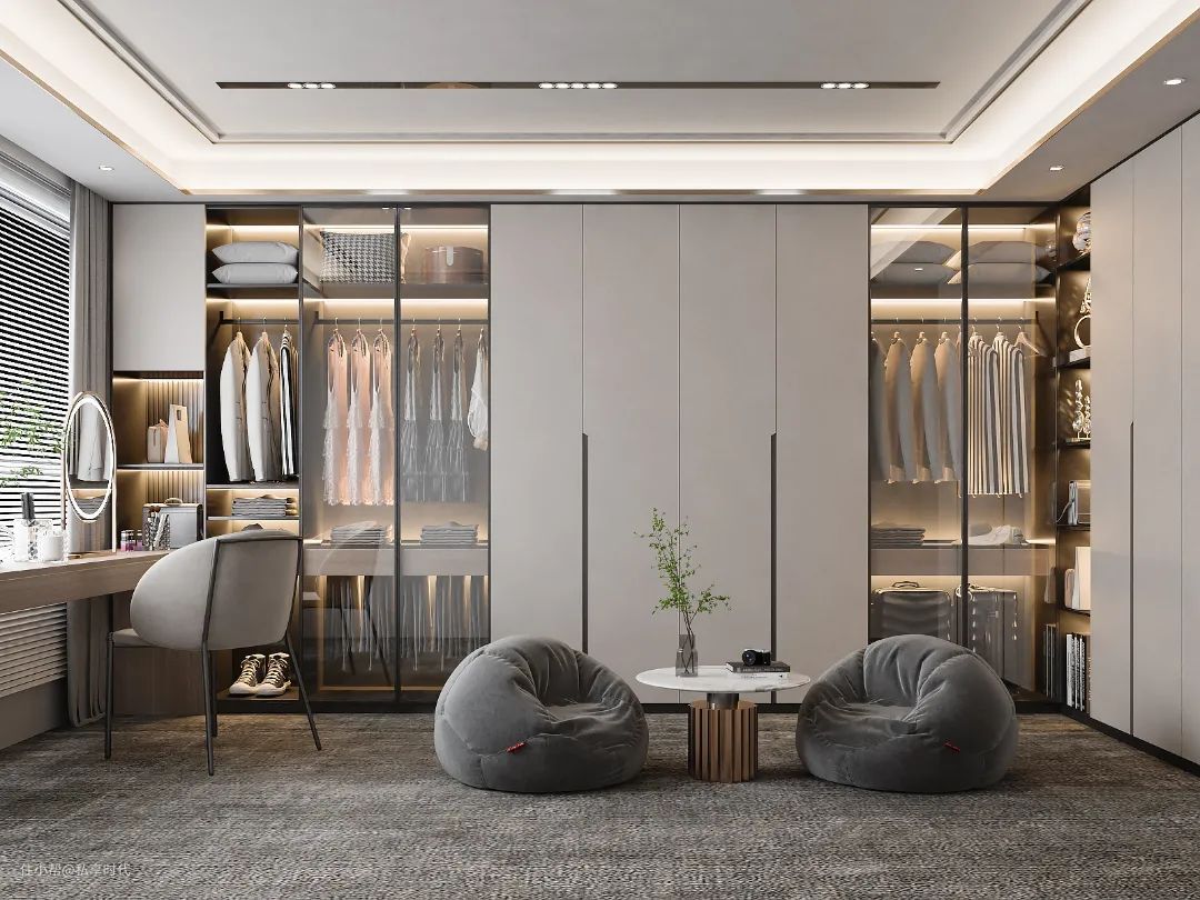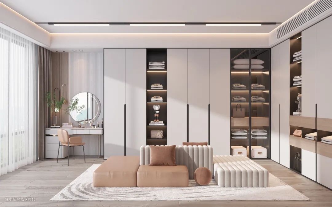 衣帽间里一种宁静而高贵的艺术平衡,集收纳、展示、梳妆为一体的肤感衣柜,将所有物品井然有序,让眼前的衣物一目了然、触手可及。