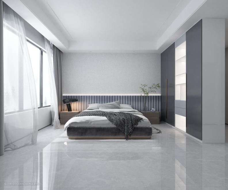高级灰瓷砖以高级的质感、精致的肌理,赋予空间独特的艺术气息和丰富的人文内涵。同色系灰调延伸了卧室的视觉效果,不需要过多的装饰,给人简约干净的感觉,营造高质量的睡眠环境。