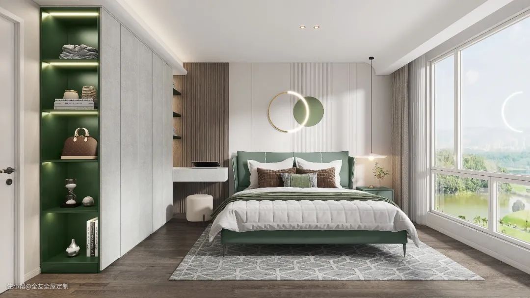卧室设计延续了全屋的风格,以白+绿作为主色调,自然温馨,带来舒缓的睡眠氛围。背景墙采用栅格板做装饰,北美橡木搭配象牙白,深浅交错,更有层次。