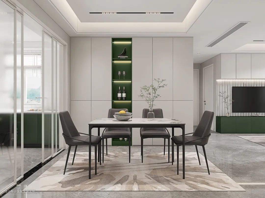 定制顶天立地式餐边柜,为餐厅带来超强的收纳空间,解放餐桌空间。中部留出竖向一字型开放格,用琉璃绿点缀,内置灯带,可置放餐具、酒类,让整墙柜体不显沉闷压抑。时尚简约的餐桌椅,可随意搭配4人位或6人位,就餐仪式感满满。