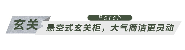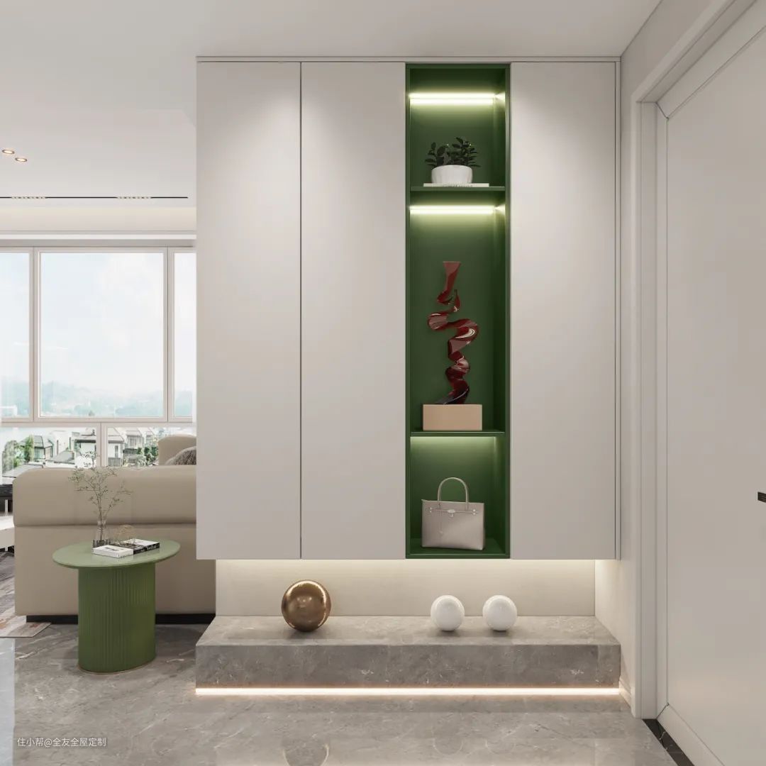 进门处定制到顶式玄关柜,超高门板+无把手设计,线条流畅,大气干练。竖向一字型开放格用琉璃绿做点缀,底部用大理石砌台,柜体悬空,内嵌感应灯带,进出照明方便的同时也带来灵动的视觉美感。