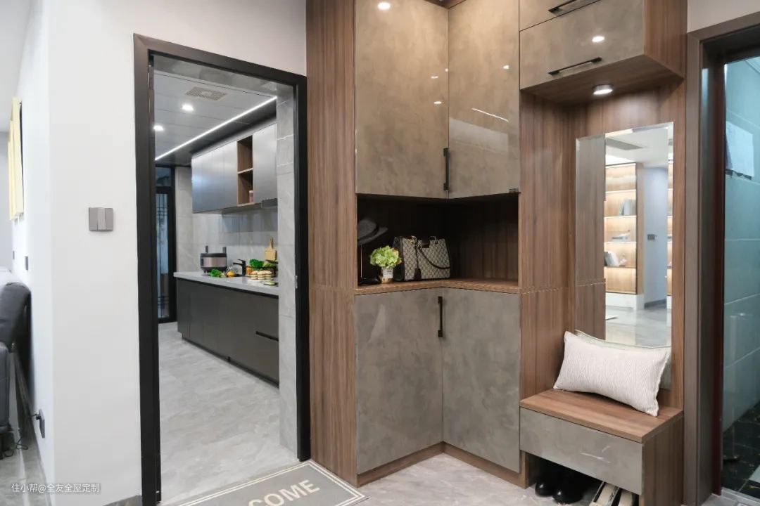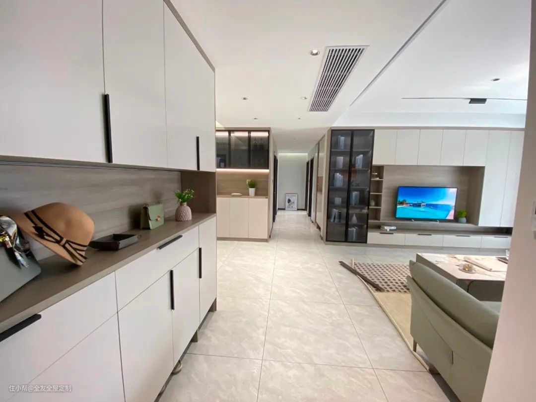 走廊右侧内嵌半开放式柜体,减轻全屋收纳压力,开放格可摆放工艺品,让走廊具备装饰功能,无把手柜门设计也让空间更显简洁美观。