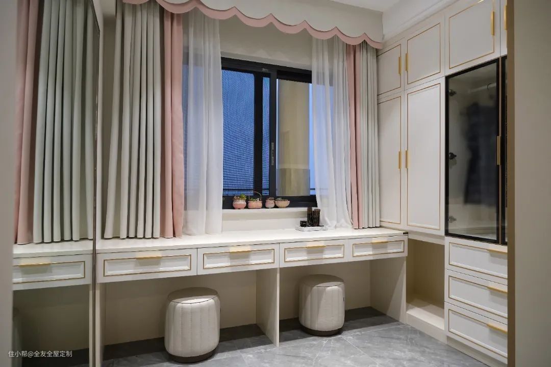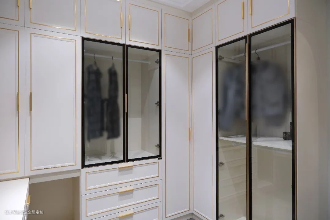为了容纳梁女士的衣物,设计师利用主卧的小房间打造独立衣帽间,沿窗定制台面作为梳妆台,优越的采光更便于装扮。靠墙定制L型衣柜,门采用“拾光新贵”中的“至奢系列”,莹白门板搭配金色拉手,勾勒出精致的时尚空间。