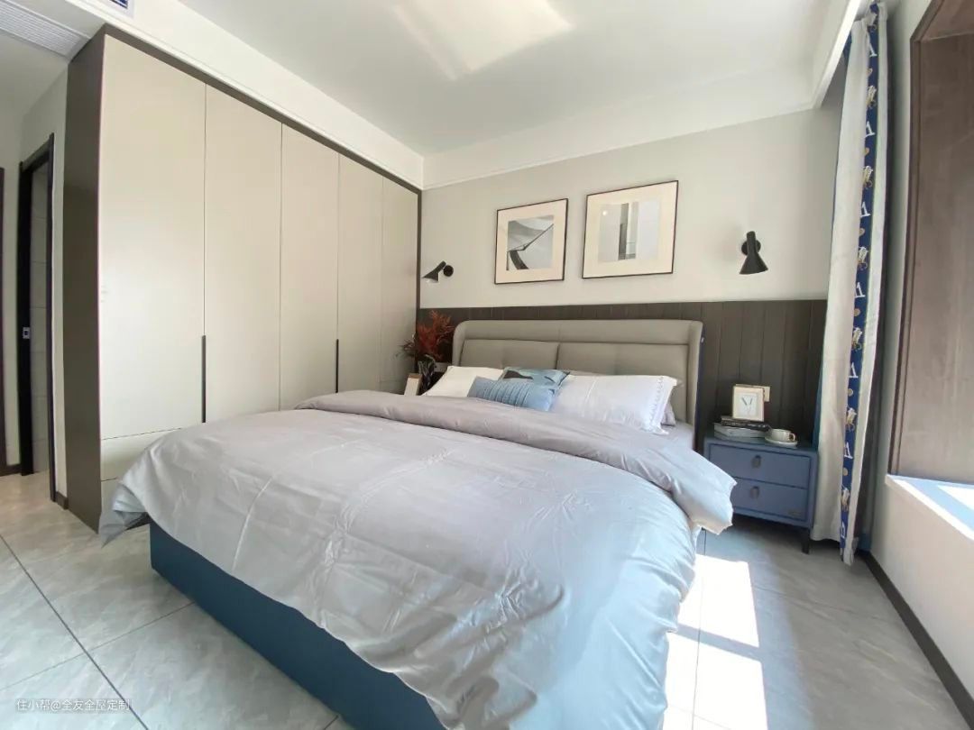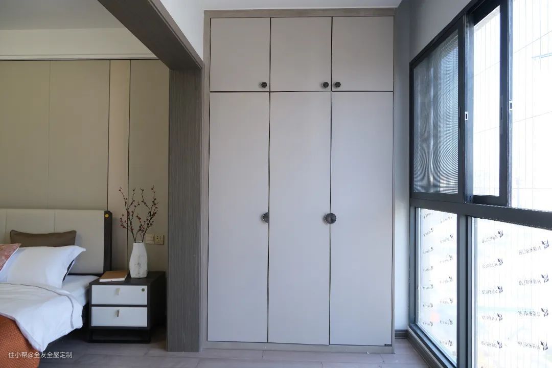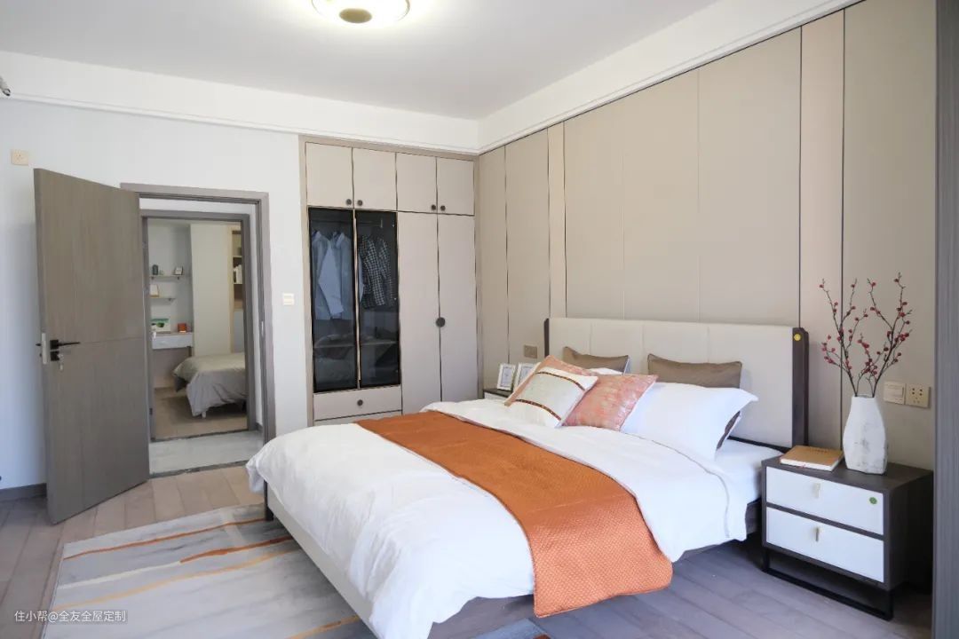 主卧采用深棕色护板墙分隔背景墙,带来深浅对比的层次美感,定制整墙封闭式大容量衣柜,轻松收纳四季衣物。