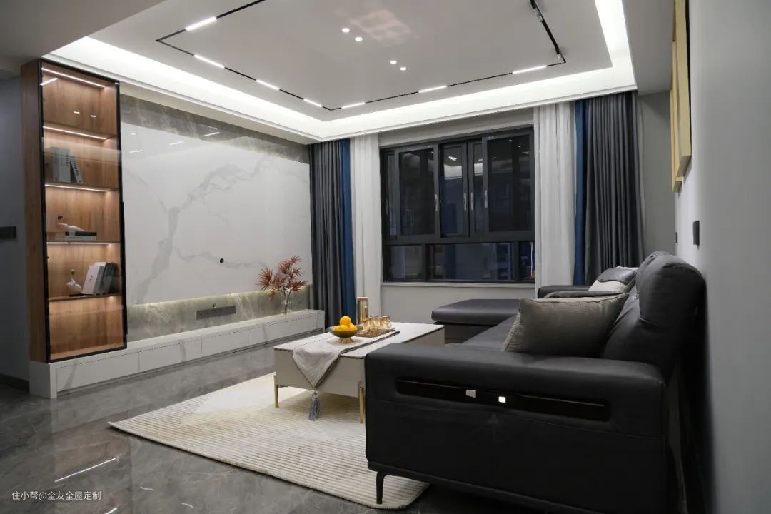 客厅利用大理石作为电视背景墙,竖向一字型柜体采用透明柜门,内置灯带,成为了客厅的展示区,而横向一字柜则可以储存杂物,台面用来摆放各种影音设备。