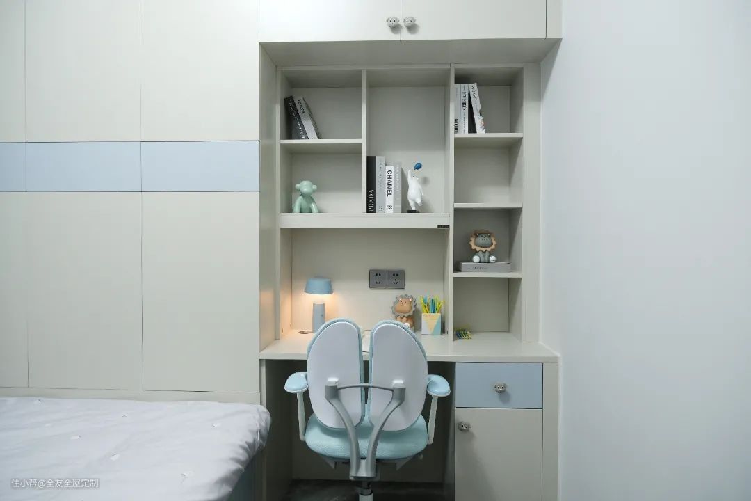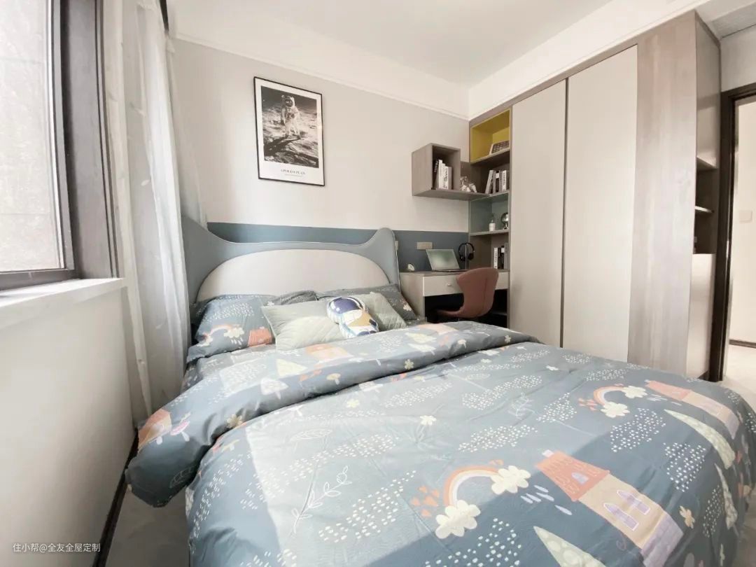 次卧打造为多功能房,定制榻榻米+衣柜+书桌柜,一体式设计充分利用空间,满足孩子休息、学习需求。