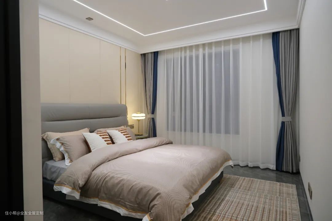 这套案例的屋主是一对90后夫妻,有一个小学在读的儿子。梁女士是服装设计师,对于家装风格要求也比较高,还需要有足够的空间来容纳自己较多的衣物。通过几次讨论,方案最终落地,设计师根据梁女士夫妇的需求,以轻奢作为全屋风格,用灯带、玻璃柜门、金属点缀装饰,提升整个家的格调。