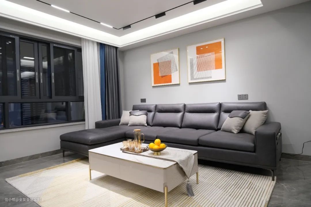 皮质黑灰沙发搭配金属细腿茶几,配以鎏金边框挂画、几何地毯作装饰,给予客厅精致氛围。