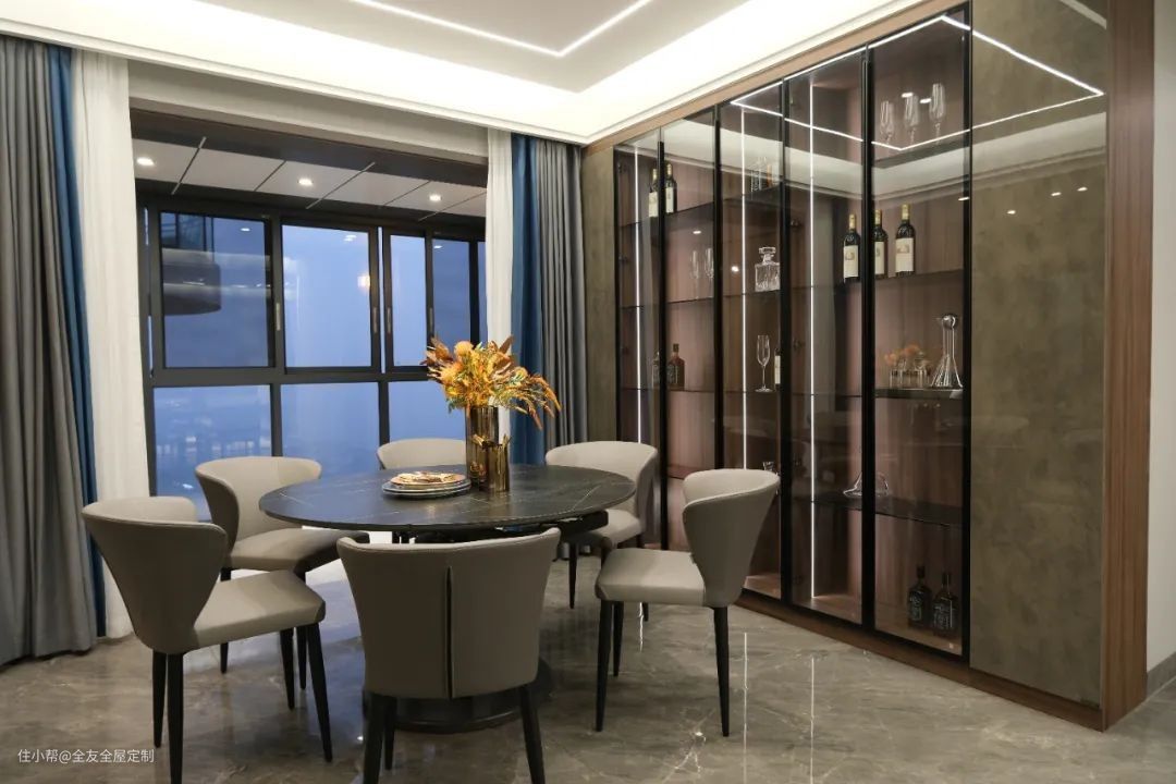 餐厅定制整墙餐边柜,透明柜门+内置灯带将珍藏的美酒更好地展示,彰显出主人的不俗品味。餐桌椅选择六人座圆桌,岩板桌面耐磨易清洁,搭配皮质餐椅,奢感十足。