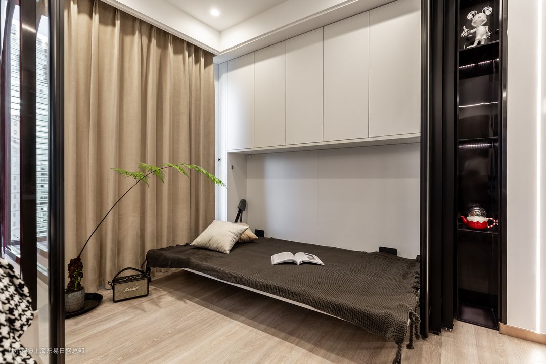 隐形床尤其适合做临时次卧使用,放在书房是再合适不过了,小巧不占地方,平时也不用经常打扫。床品完全收纳到柜子里,在书房办公或者学习、休闲,视野都会非常舒适。