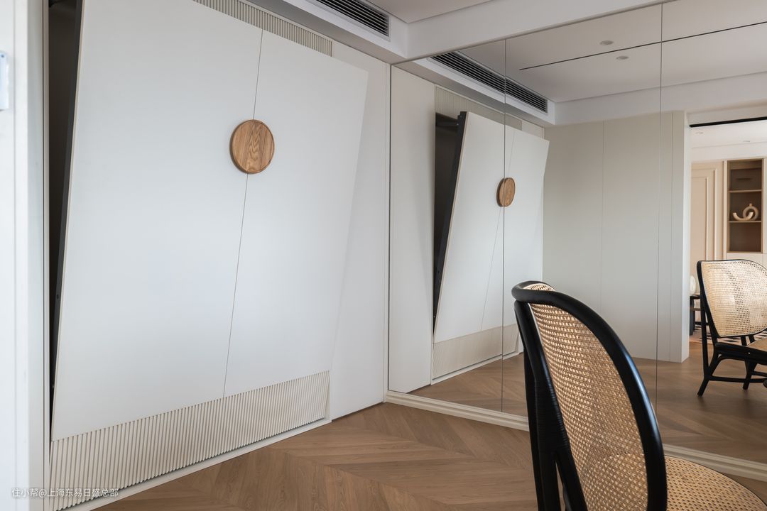 书房改衣帽间+隐形床,靠墙做整体橱柜,放置衣帽+隐藏门,提升空间利用率。
