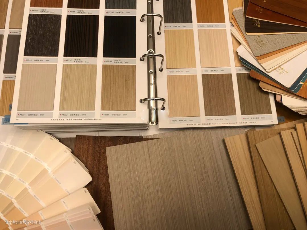然后在颜色选择上的一些小tip:大面积木饰面上墙,比色板上的一小块颜色更深,且不同光线下的木饰面,颜色深浅是不一样的,所以大家选择时最好能在不同明暗的光线下选择色板,这样才不会和上墙后的心理预期差别过大。