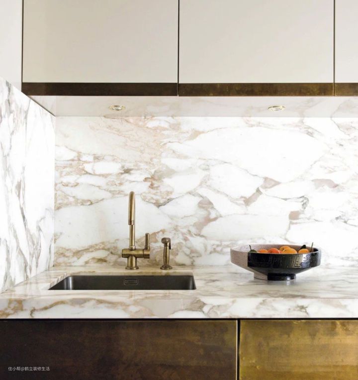 在地柜和吊柜隐藏的里边用便宜的瓷砖,也不用讲究什么规格,只要贴上之后平整就可以了,外漏的墙面可以贴一张大板,比如800×800的或者是750×1500,最理想的状态,让地柜盖住几公分,再让吊柜盖住几公分,瓷砖的绝大部分都是露出来的。