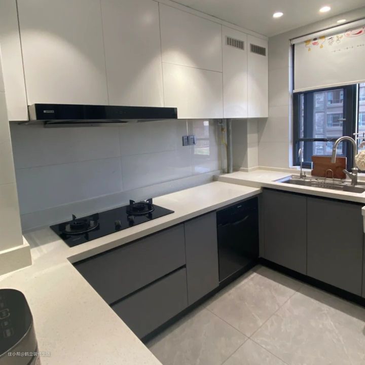 但是这样做对吊柜的高度有精确的要求,吊柜做的高了,安不上,吊柜做的低了不好看,想要实现最终的效果,瓦工师傅,厨房吊顶还有全屋定制,三方一定要衔接的特别好。