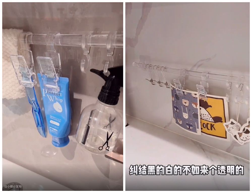 这个十来块的挂杆也很好用,它利用粘贴式的卡扣进行安装,搭配一些挂钩和夹子,可以起到不错的收纳作用,无论是用在卫生间、阳台,还是书桌前,都很合适。