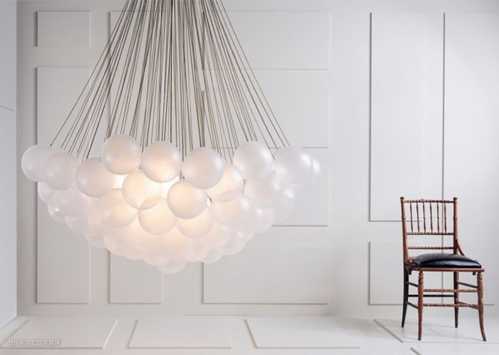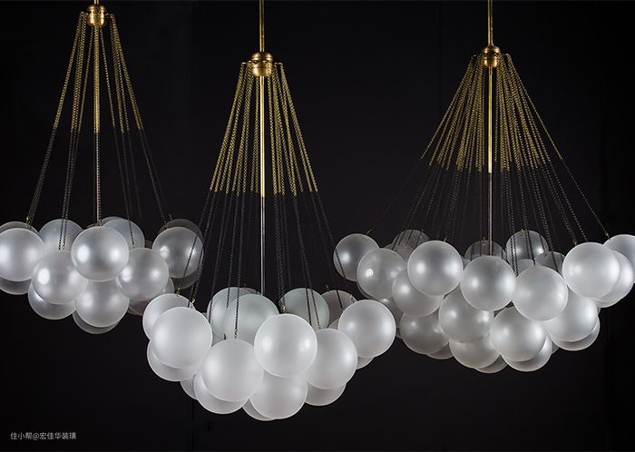 Apparatus云朵灯,云是由许多像气球的透明玻璃球体组成的一个形状不规则的灯,具有云的柔美和柔软的感觉。它是经过手工磨砂制作的,通过中间三个核心光源,发射出柔和的光芒。