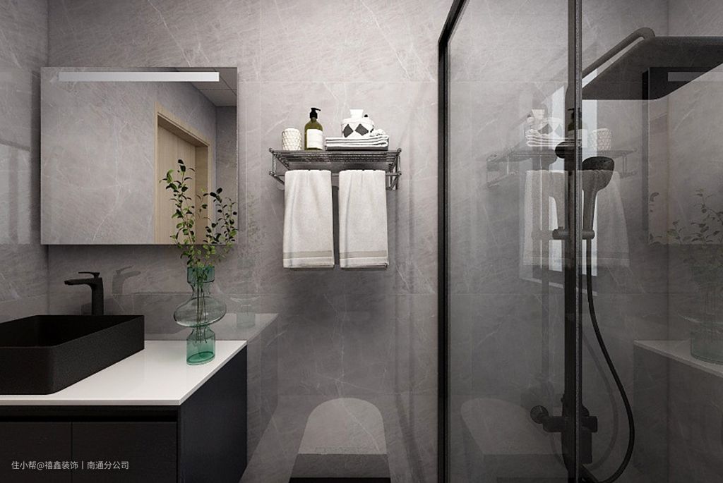 【卫生间】洗漱区,马桶,淋浴区三种功能依次排列,黑白为主的卫生间空间,台上盆的设计,极简的白色台面,带来更多高级感。