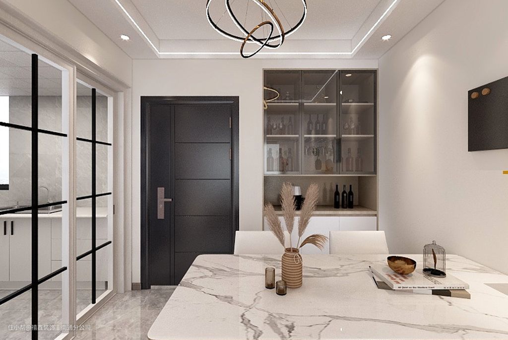 【餐厅】大理石餐桌搭配上白色皮质餐椅,侧边墙面挂一个极简的艺术摆件,餐桌上方装着简约轻奢的吊灯,让整个用餐空间显得情趣优雅而端庄。
