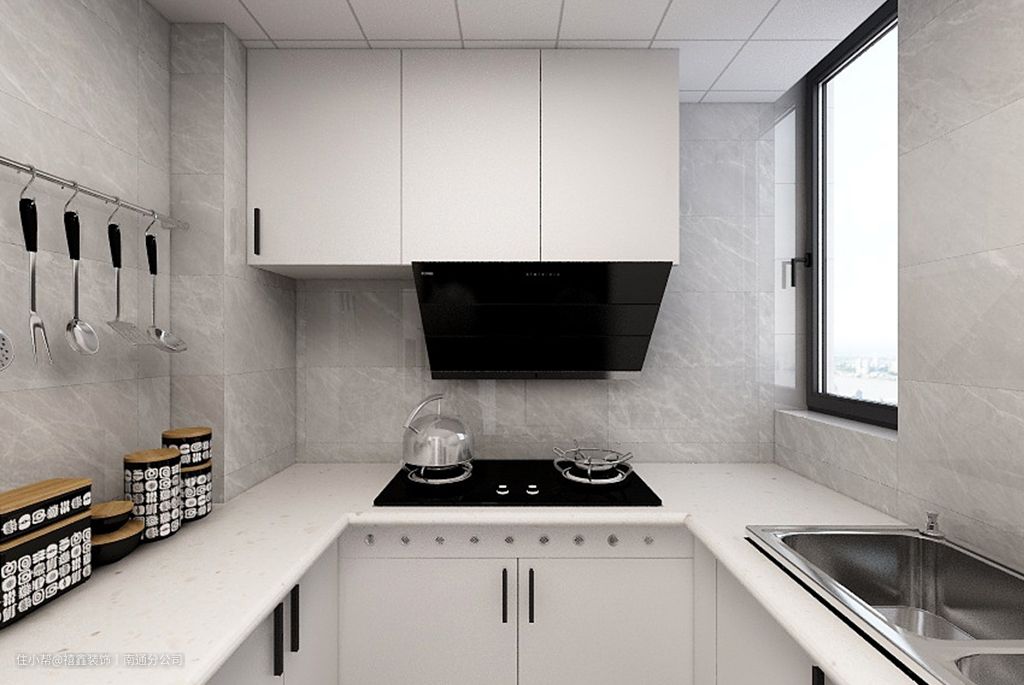 【厨房】灰色的墙面搭配纯白色的柜体,墙面运用金属管设计了一个悬挂区,放置常用的锅铲等物,根据业主习惯设计了厨房动线。