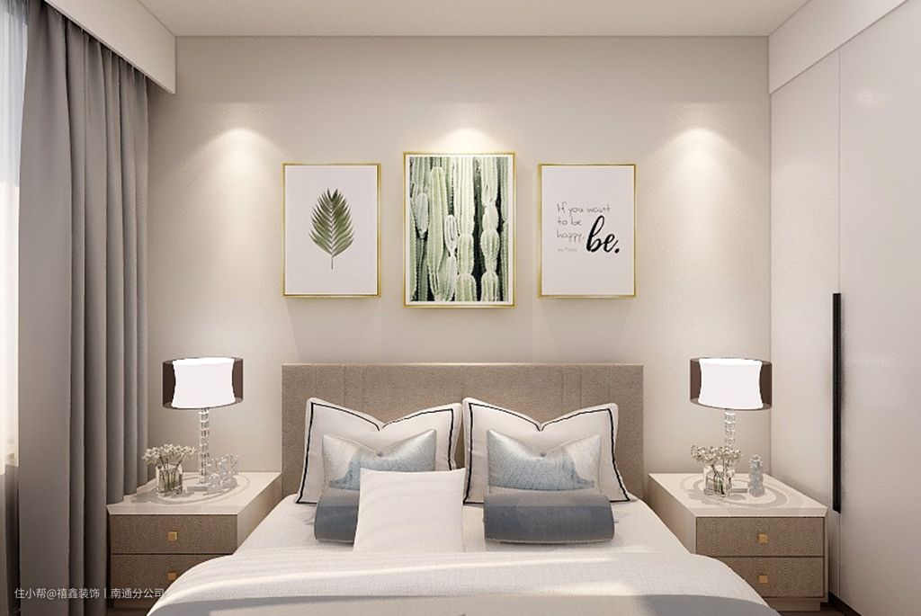 【主卧】卧室整体米白色的墙面,床头墙挂上简约的挂画,布置上布艺的床与床头柜,搭配上高挑的水晶台灯,整个空间都显得格外的自然舒适而淡然。