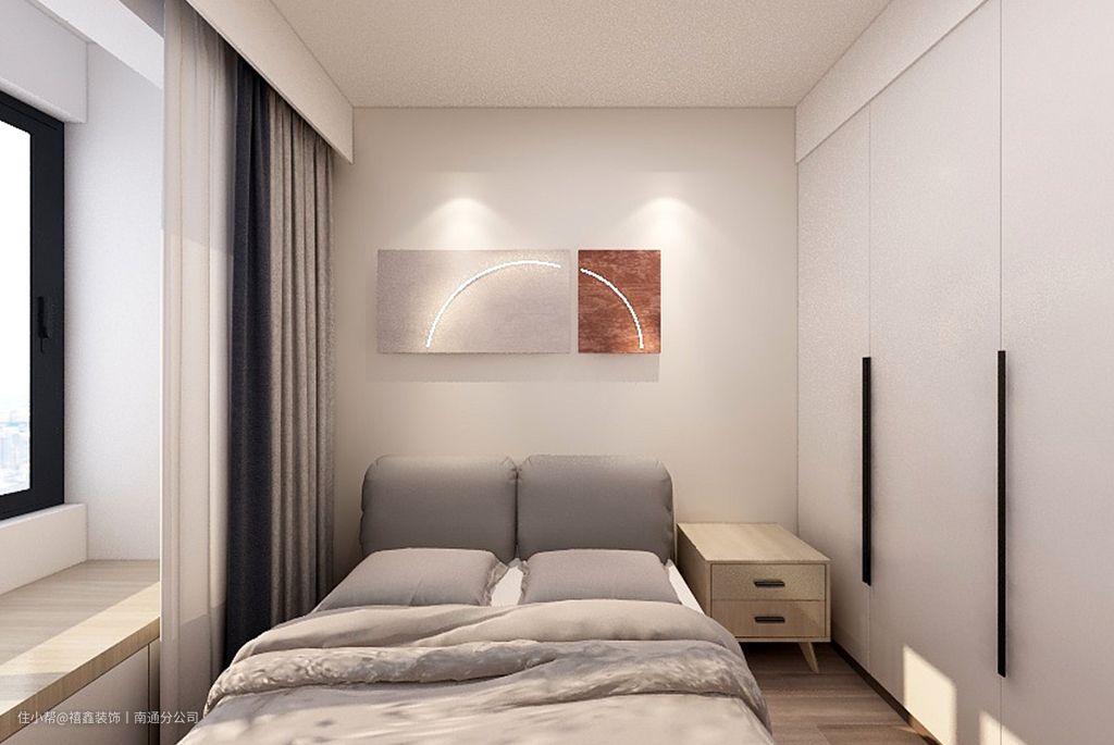 【次卧】浅咖色的空间主色,搭配单侧实木床头柜,飘窗也是加入了木质感的窗台,到顶的衣柜满足父母的衣物收纳需求。