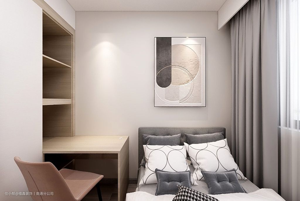 【次卧】儿童房也是以浅咖色的墙面,布置浅灰色的单人床,床头墙挂上纹理感极强的几何图案装饰画,从衣柜中 延伸出书桌,整个空间都显得格外的清新。