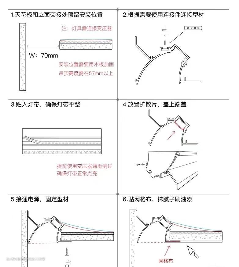安装步骤参考图4 ,安装好之后油漆工批腻子打磨好之后最后只能看到铝合金灯体,而且这种形式较普通反光灯槽更不容易藏灰,更节省吊顶高度。(参考图5~图7)快快用到您的家里吧!🆕🆕🆕🆕