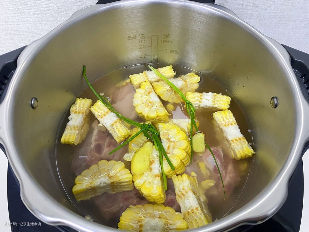 食材和调料按引导都就位了,接下来就要盖上压力盖进行高压煮了,玉米排骨汤要煮烂点汤才好喝。