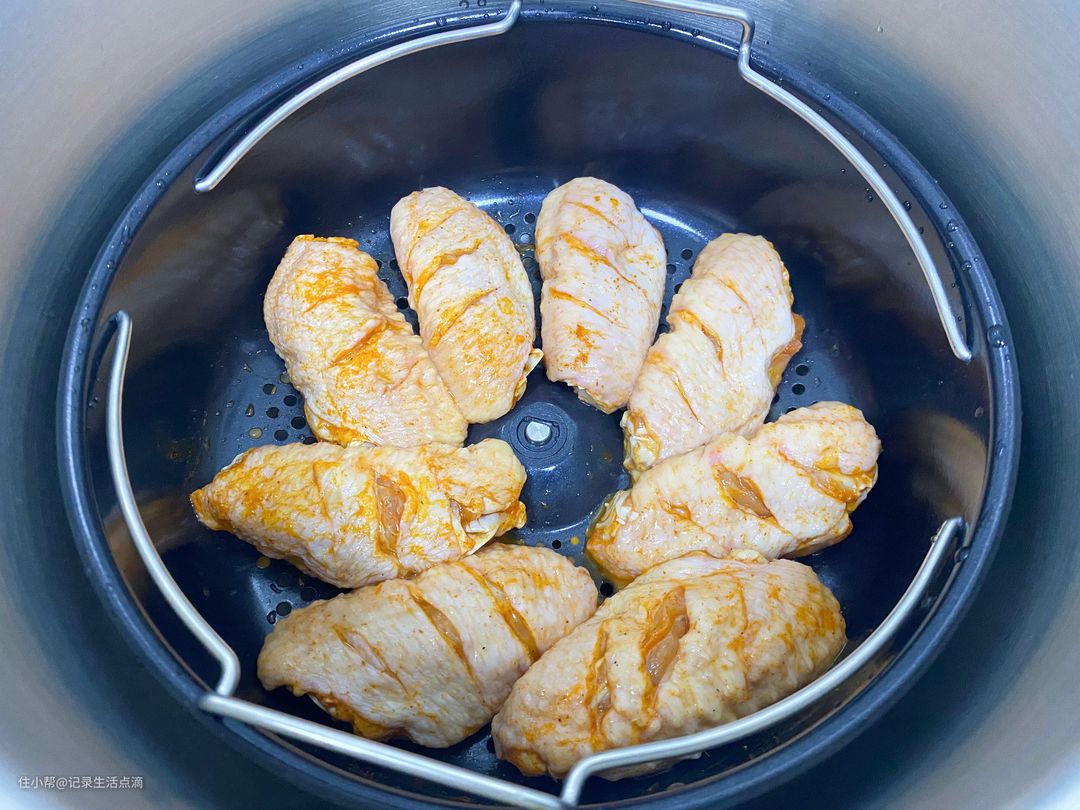 在内锅中装上烤篮,这样烘烤时食材就能360°旋转了,依次放入鸡中翅,8个正好一锅。