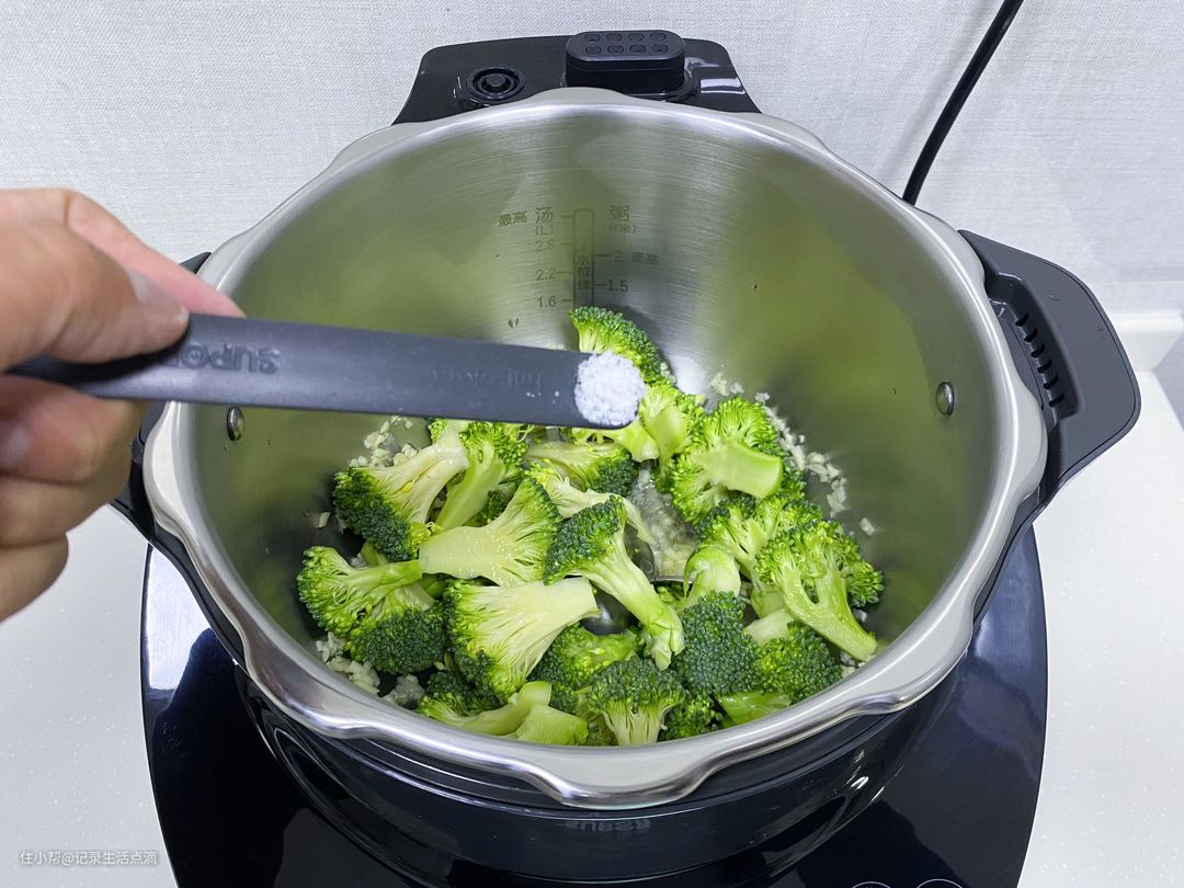 爆香完成后倒入切成小朵的西兰花,再均匀撒上3小勺食盐,随机配置了大小两种调味勺,根据菜谱的引导使用即可,在调料用量上小C主厨机拿捏得死死的。