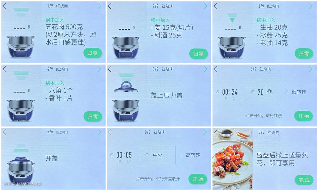 给大家展示下红烧肉这道菜的智能引导是怎么样的,总共有9个步骤,每个关键步骤都有指导,每步都巨细无遗,厨房小白跟着这些步骤操作也能轻松做出色香味俱全的红烧肉来。