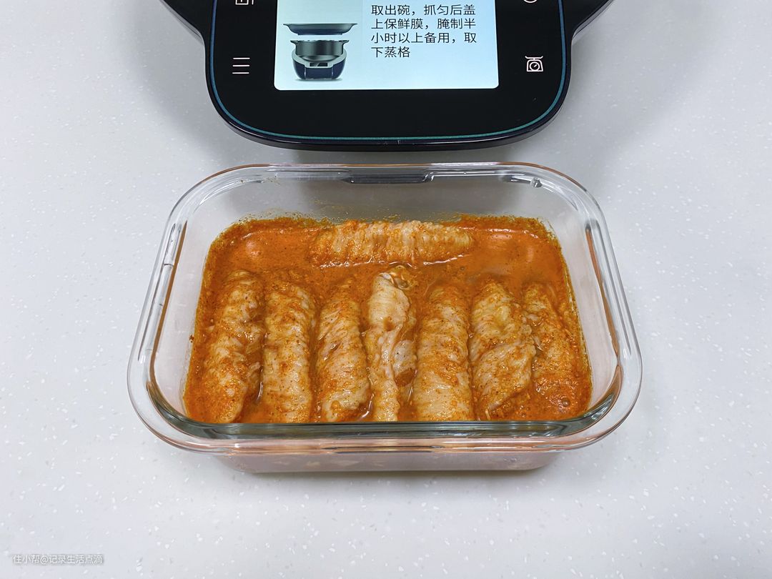 按菜谱引导准备6-8个鸡中翅,再放入12g奥尔良腌料进行腌制。