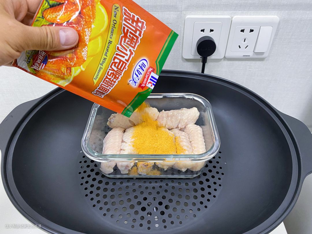 可以借助蒸笼底座就行称重,先放入鸡中翅,然后归零再倒入12g腌料。关于腌料的添加量大家还是要看看腌料的说明,毕竟每种腌料的咸度会有所不同。