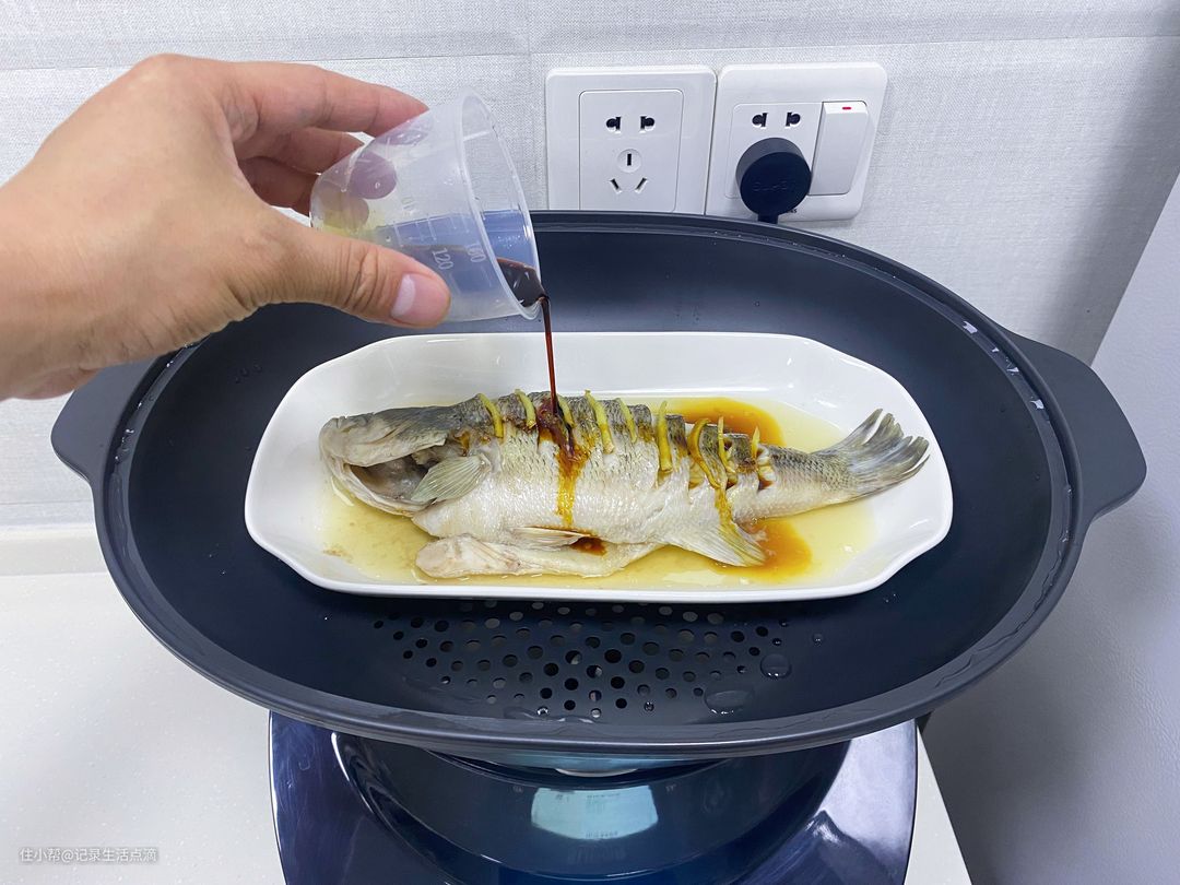 蒸好后均匀淋上20ml鲜酱油,可以用随机配置的量杯来控制鲜酱油用量。