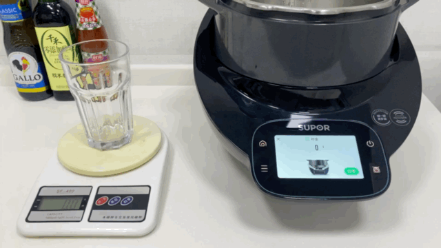 小C主厨机的称重可以精确到1克,我们实际来测试下称重的精准度。一小杯水用食物秤称得重量为108.8g,然后倒入小C主厨机,屏幕上显示重量为108g,精准度还是很高的。