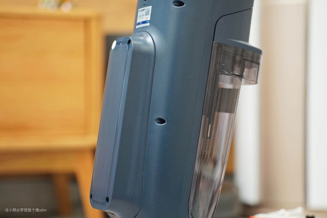 而除了手柄外侧的两颗按键外,在手柄内侧还有一个喷水控制开关,因为这款洗地机是一款干湿两用的机器,在不按下喷水按键时,这款洗地机就是一台高效的吸尘器,不但可以用于清洁瓷砖、木地板,还可以用来清洁地毯;而按下喷水按键后,这款洗地机就变成了一台清洁能力更强大的洗地机。