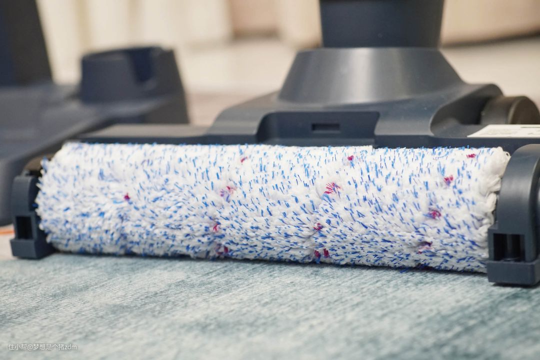 我们可以看看这个滚刷的细节,其中蓝色和白色的纤维是软刷毛,红色纤维则是硬刷毛,这种软硬刷毛相结合的设计,在清洁地毯和地面顽固污渍时效果会更好一些,尤其是在清洁地毯的时候,硬刷毛能深入到地毯纤维内部,将灰尘和细沙扫出,然后凭借强大的吸力将脏污全部清理干净。