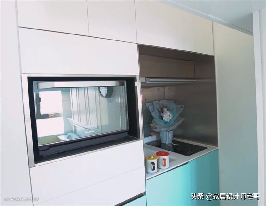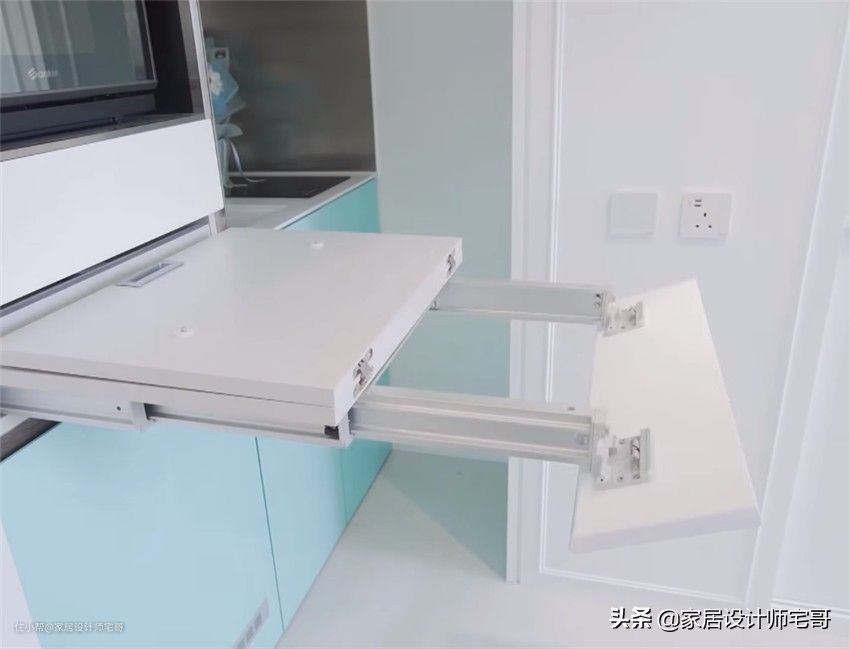 微波炉下面其实是一个隐藏式的桌板,需要的时候可以拉出来当做一个切菜的区域,也是夫妻俩的小餐桌,很方便也很实用。