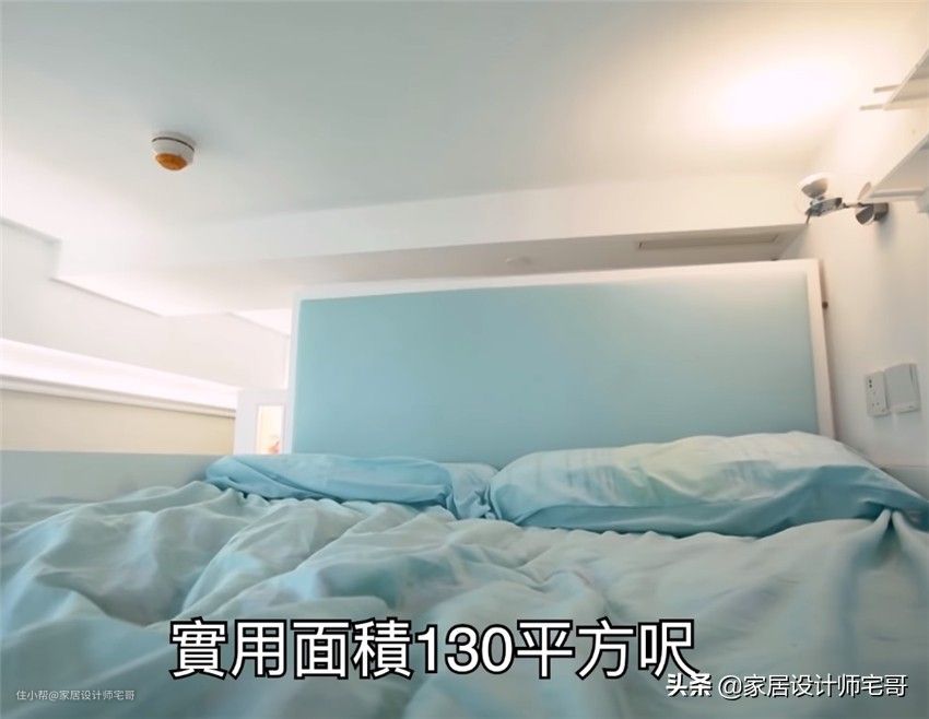 上去便是夫妻俩的床了,白色的墙壁,蓝色的床上用品,有一种清新又温馨的效果。