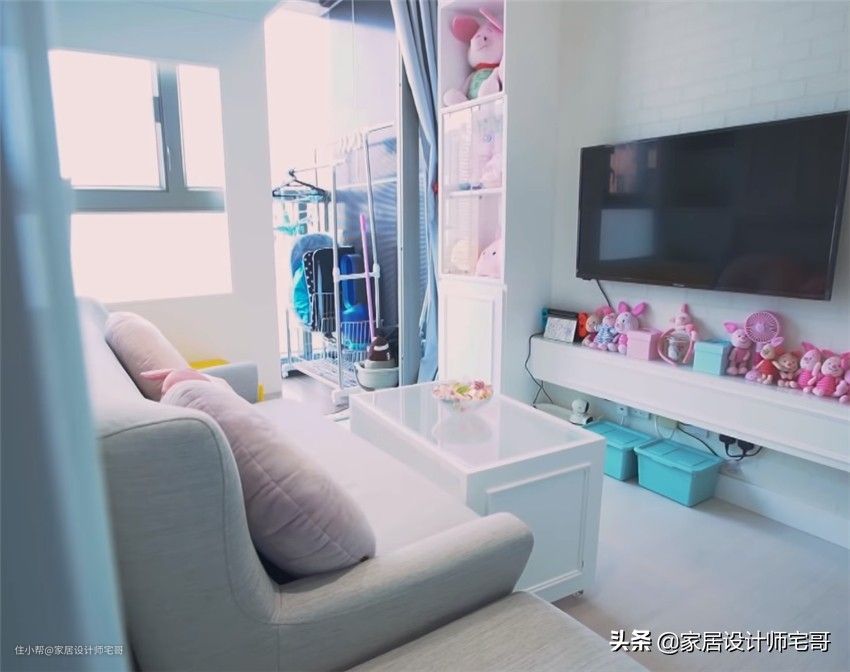 客厅和阳台衔接的地方打造成了展示柜,放置着女主人喜欢的各种各样的小玩偶,而阳台上则是晾衣服和放置杂物的地方。