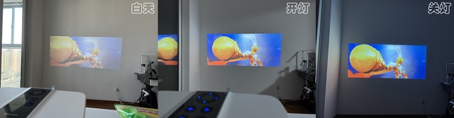 咱们再接着一下他这个光亮度,通过下面的图片对比,可能感觉晚上的效果要更好一些,因为其对比度更高,其实白天的效果也是不错的,900ANSI流明亮度,即使是在白天的情况下,画面也是非常的清晰,不影响观看体验。