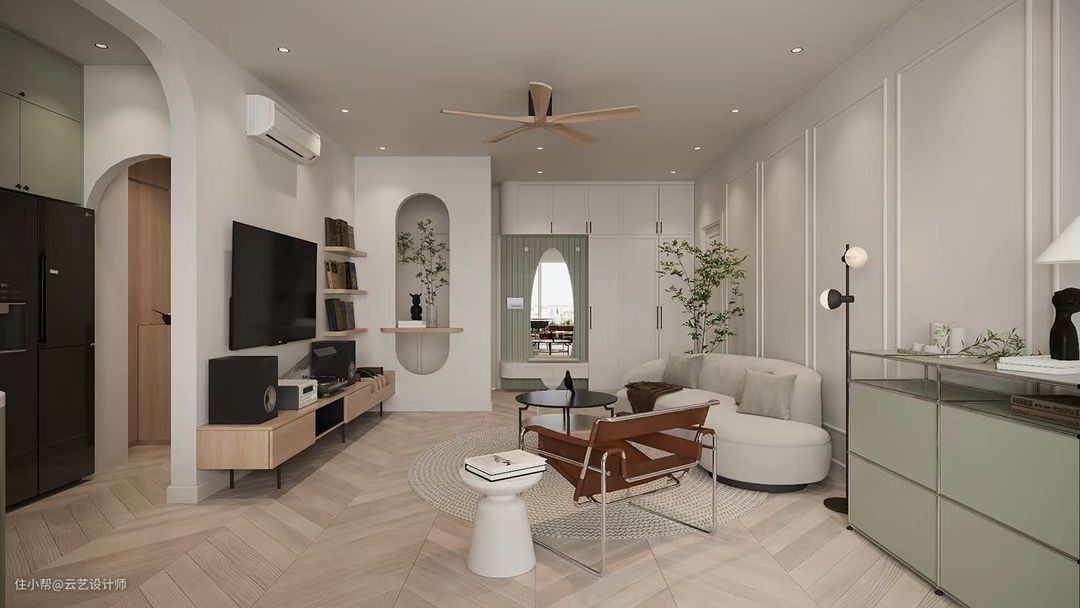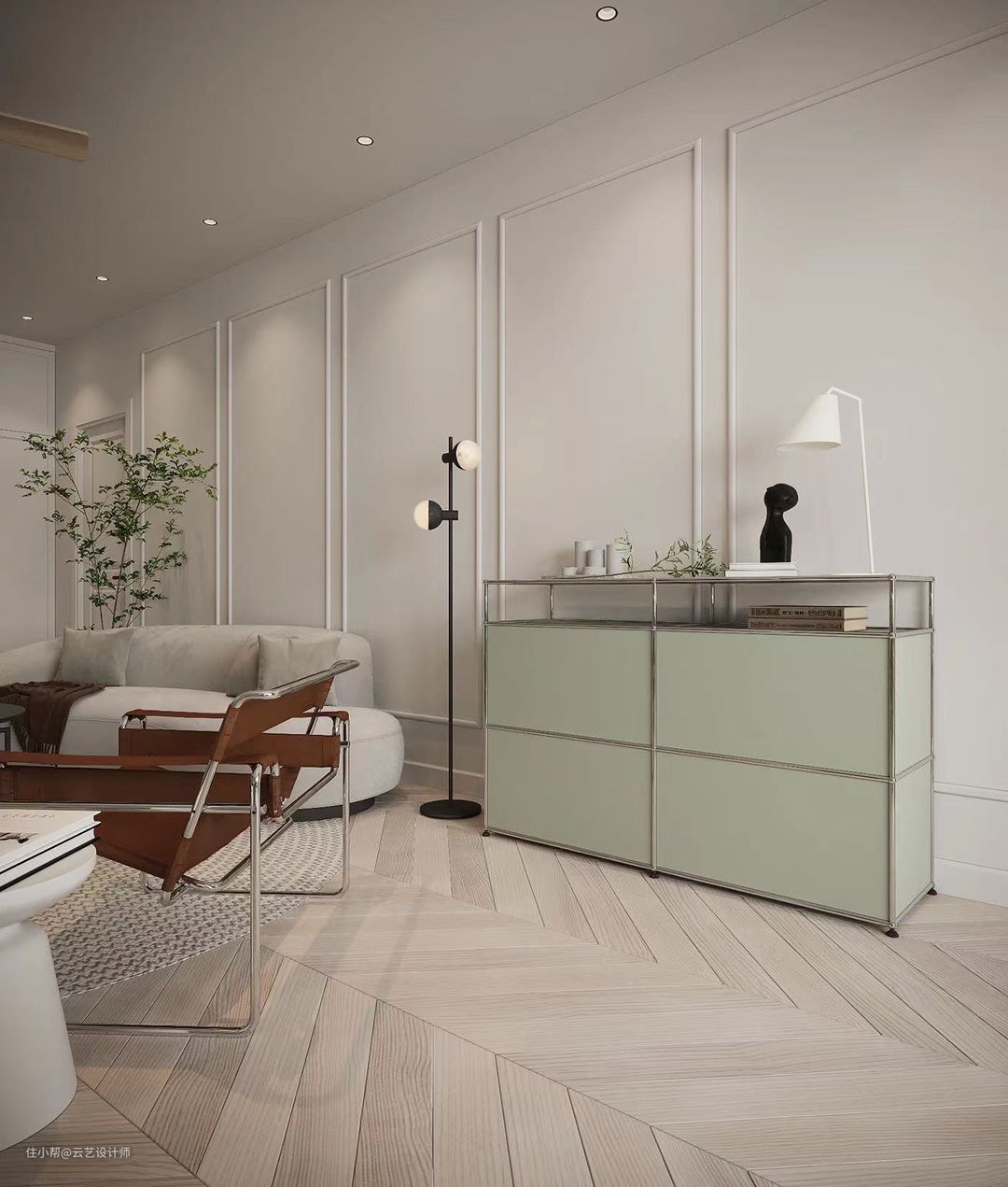 ◈客厅以温柔的奶白色调为主,搭配优雅法式薄荷绿,带给人一种温柔的态度,和浪漫的情怀。简单优雅是空间设计主基调,结合浅灰色布艺沙发,绿色家具,让整个空间脱颖而出。