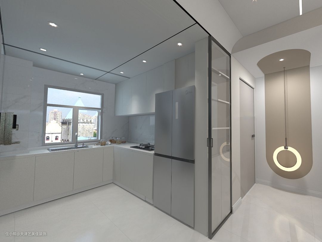 厨房吊顶采用无主灯设计,整体感觉会更加高级,光线分布更加均匀,U型厨房设计宽敞明亮。