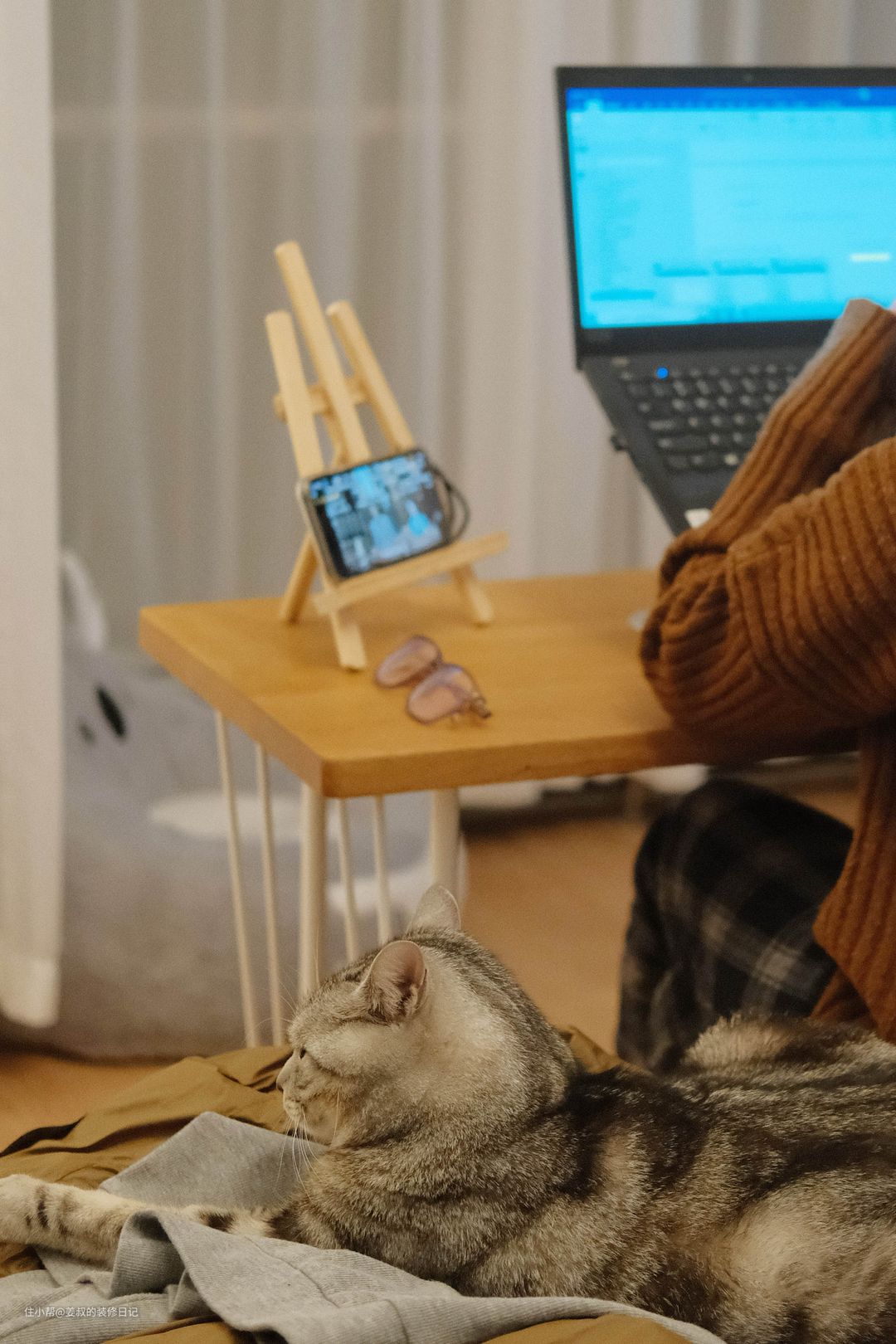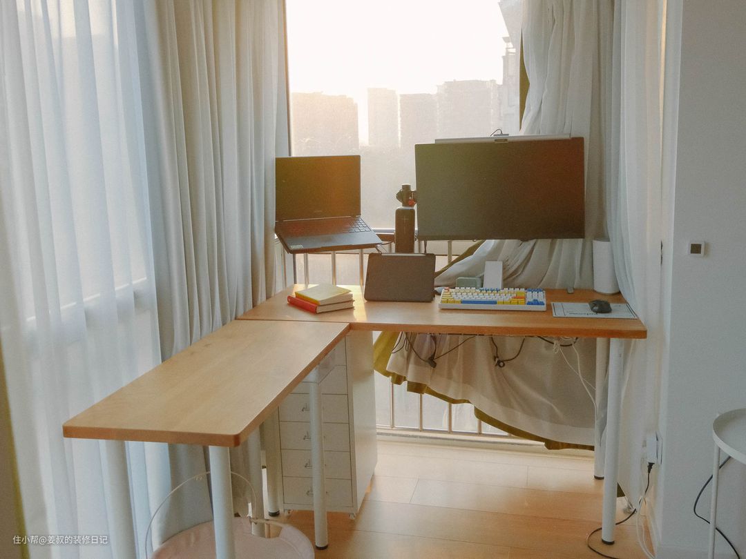 布局方面,用两块桌板做了L型办公区,大板作为主办公区,可以放电脑、键盘等,正好将西侧窗户基本占满;小板作为辅助办公区,桌腿配了宜家的克瑞尔脚轮桌腿,可以灵活移动,有时候我媳妇也在主卧办公,就可以移动到床前,特方便;大板用了宜家阿迪斯桌腿,不用移动,胜在价格便宜。如果担心桌角磕碰,可以让商家做圆角处理,不收费。