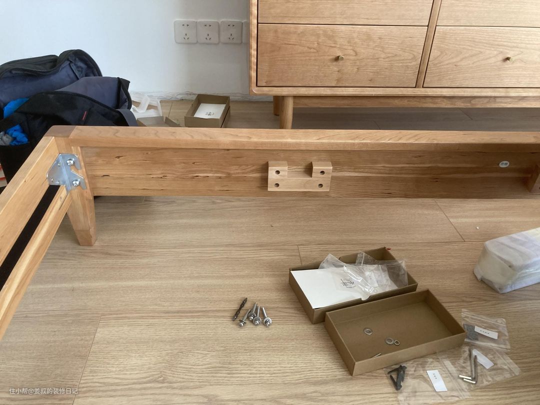 根据卧室尺寸,定了1.6米的,宽度40cm,即便安装好床后,中间还有70cm的空间,留作过道完全够用,不会太拥挤。材质还是跟主卧床一样,选了樱桃木的,造型非常简单,把手配了黄铜的,看起来很有质感。