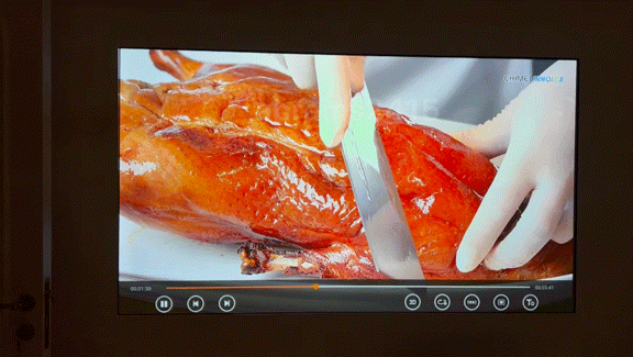 ▲播放一段4K《北京烤鸭》测试视频,烤鸭表面及鸭肉横切面色泽和实际原视频没有太大偏差。整体色彩表现出较高水准。