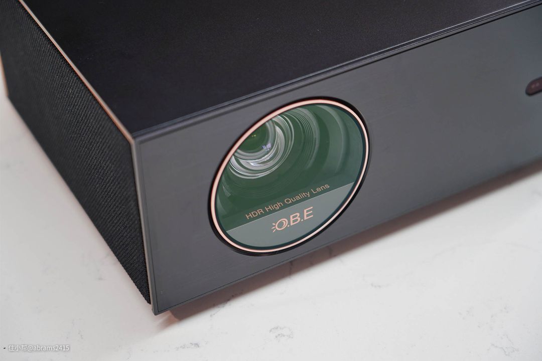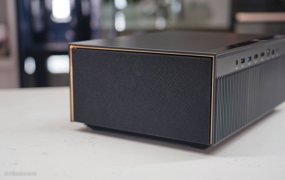 ▲在机身右侧配置有激光对焦和摄像头全向梯形校正传感器,它能实现自动对焦、自动避障、自动对齐幕布、和全向梯形校正功能。