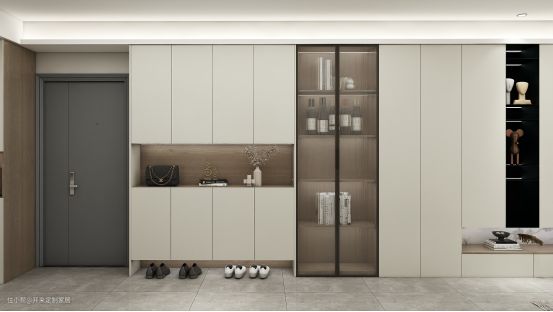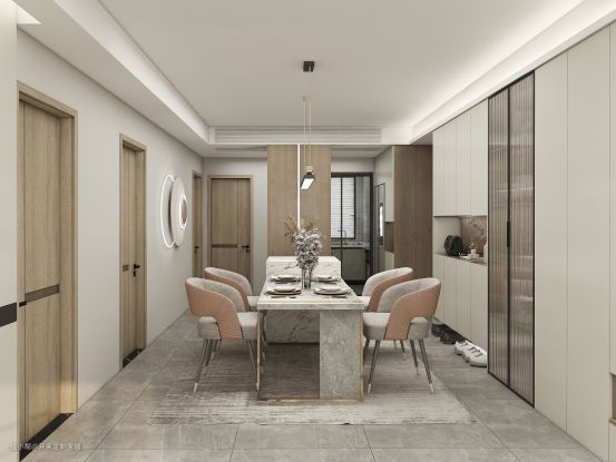 玄关开始,客餐厅一字展开,玄关柜、餐边柜、厅柜一体设计