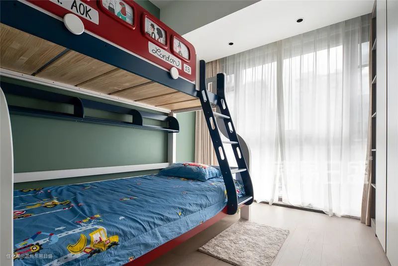 由于业主有两个儿子,为了增加兄弟俩的感情,让他们共用一个房间,上下铺的装修,不仅高效利用了垂直的空间区域,还留了空间来用作玩耍与收纳。