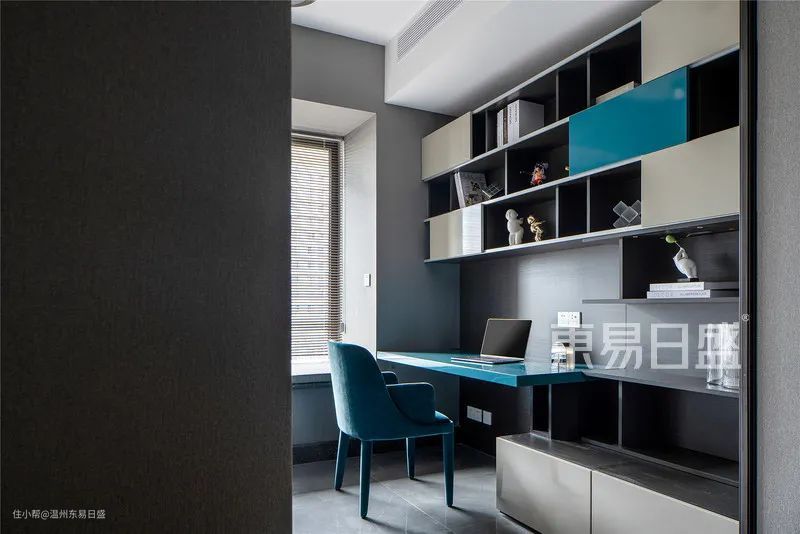 独立的书房区域,整壁书柜增加书籍收纳,地面采用灰色地板,书桌椅沿用客厅的蓝色,两者搭配让整个空间更有氛围感。